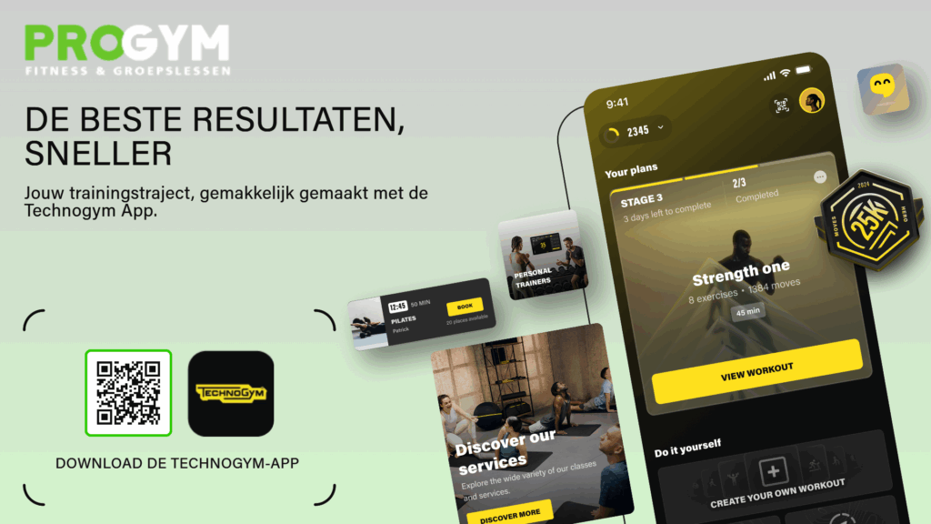 Als lid van ProGym krijg je automatisch toegang tot de TechnoGym-app – hét digitale verlengstuk van je lidmaatschap. Met deze app boek je eenvoudig live en online groepslessen en heb je toegang tot meer dan 350 trainingen die je kunt volgen in de club, thuis of zelfs buiten.